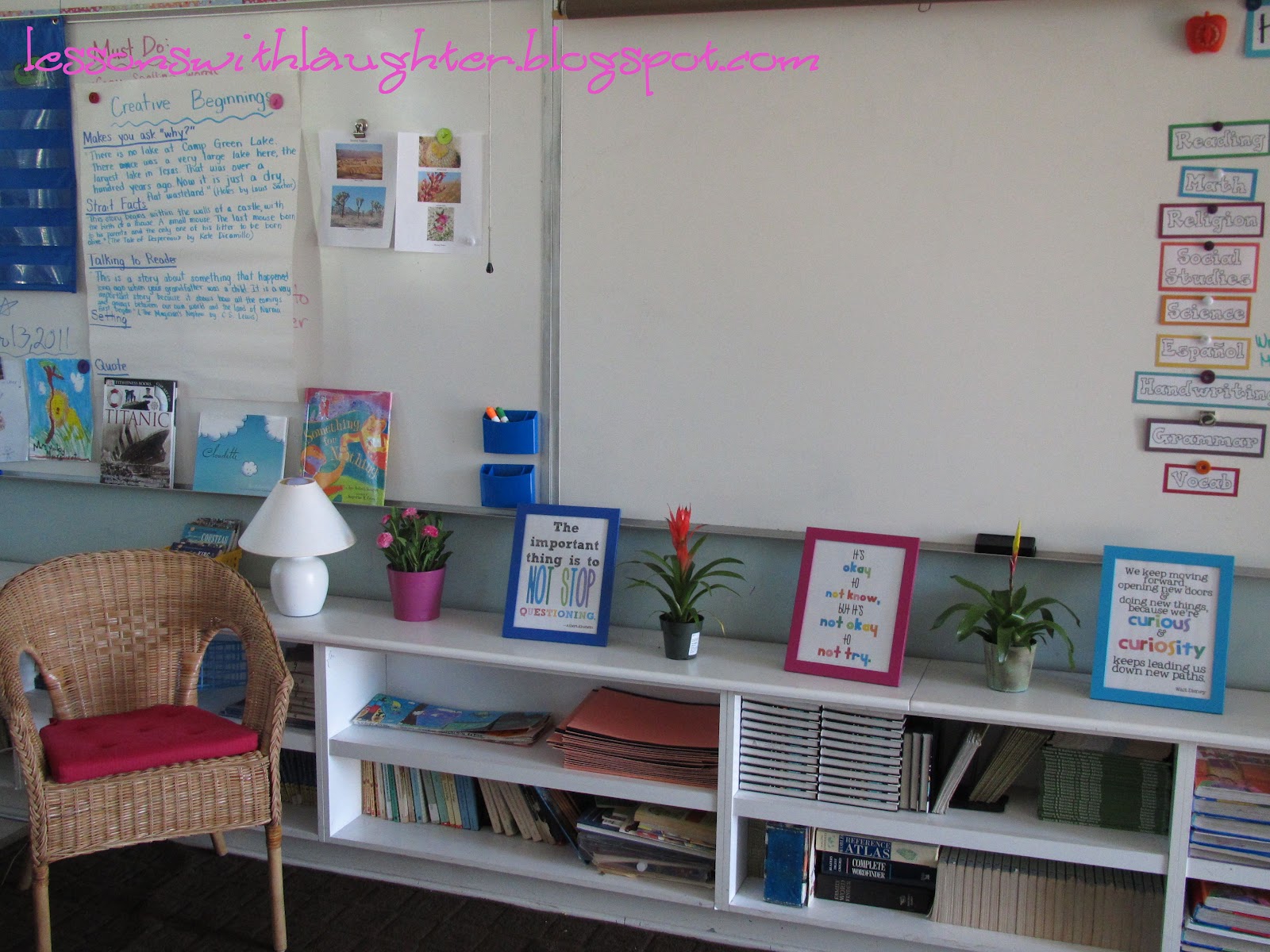 your classroom is terrific! Your little sign on top of the library shelf ("Wrong is wrong…") is great! I love that St. Augustine quote and always told my students that. I think it's a really important thought and I'd always hoped it would make them think before doing.