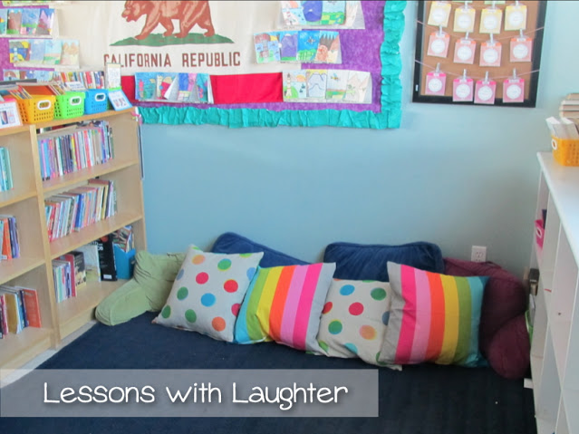 I think today I am going to have to say our class library BECAUSE I just got these amazing new pillows from IKEA!! Aren’t they wonderful? I loved the bright colors in both spots and stripes, and couldn’t resist! Plus, the pillow covers can come off so that I can through them in the wash after they have had lots of reading done with them and are starting to look a little dingy!