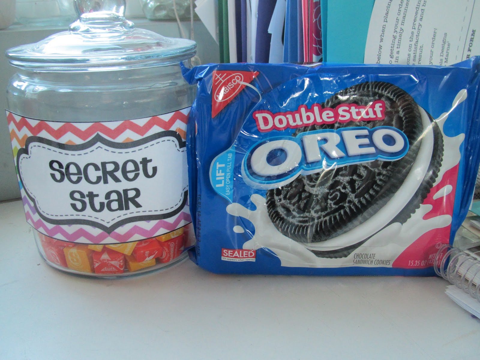 Oh, and I gotta have something sweet in my classroom! Definitely have taken candy from our Secret Star jar on several occasions! And I love Oreos! Which, by the way, did you realize that “Double Stuf Oreos” only has one “f”? I was reading The Lightning Thief to my class today and the word came up (Ares gave them a backpack with them) and I thought for sure it was a typo, but then when I grabbed my stash of them after school, I was shocked! Just proof that even teachers are constantly learning new things! 馃檪