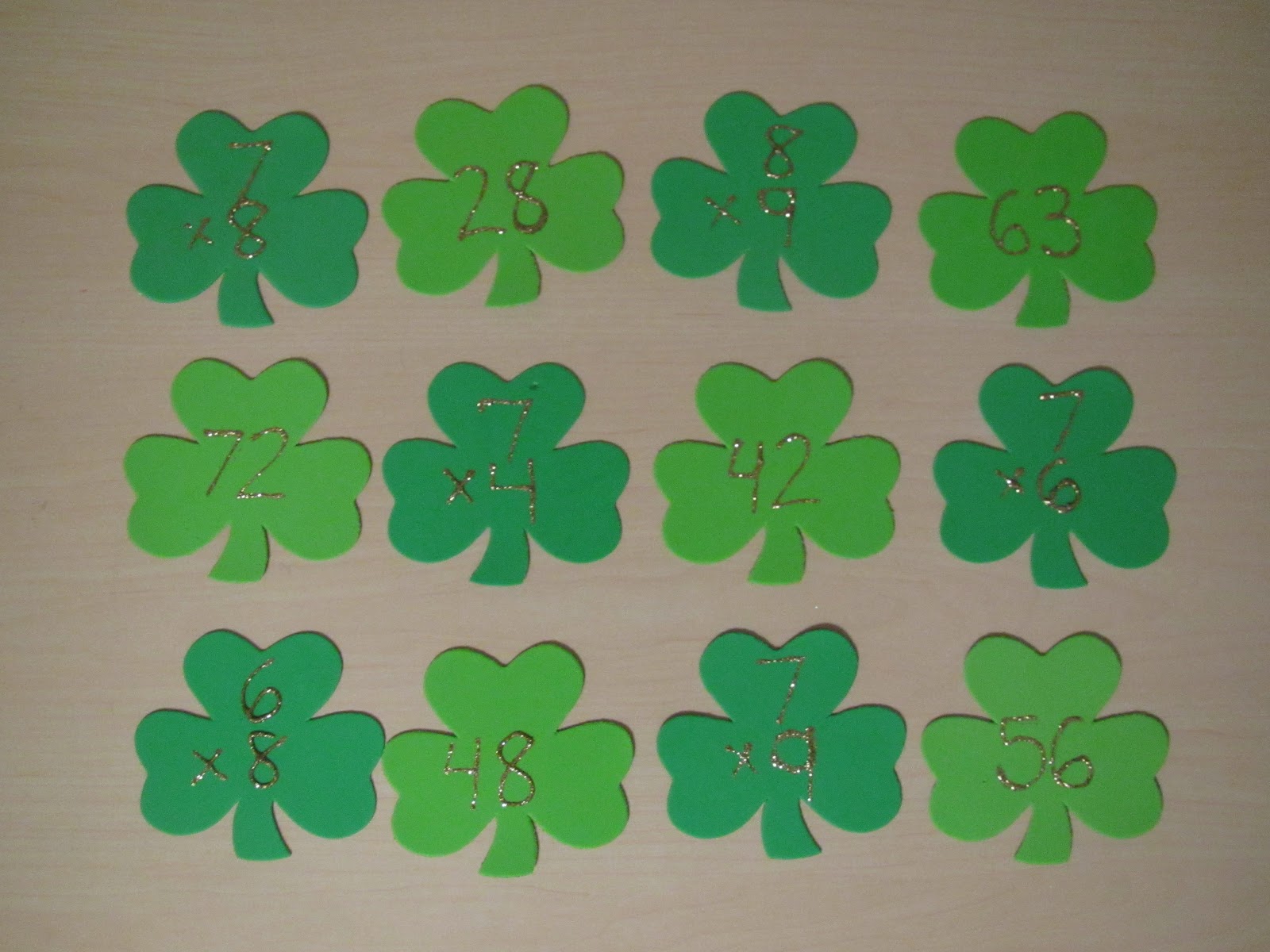 I used the shamrocks to make a multiplication memory game. I used gold glitter glue that I got from Joanne’s to write down some of the multiplication facts (I stuck to 7’s, 8’s, & 9’s in the game pictured) that they are struggling with on the dark green shamrocks, and the answers on the light green shamrocks.