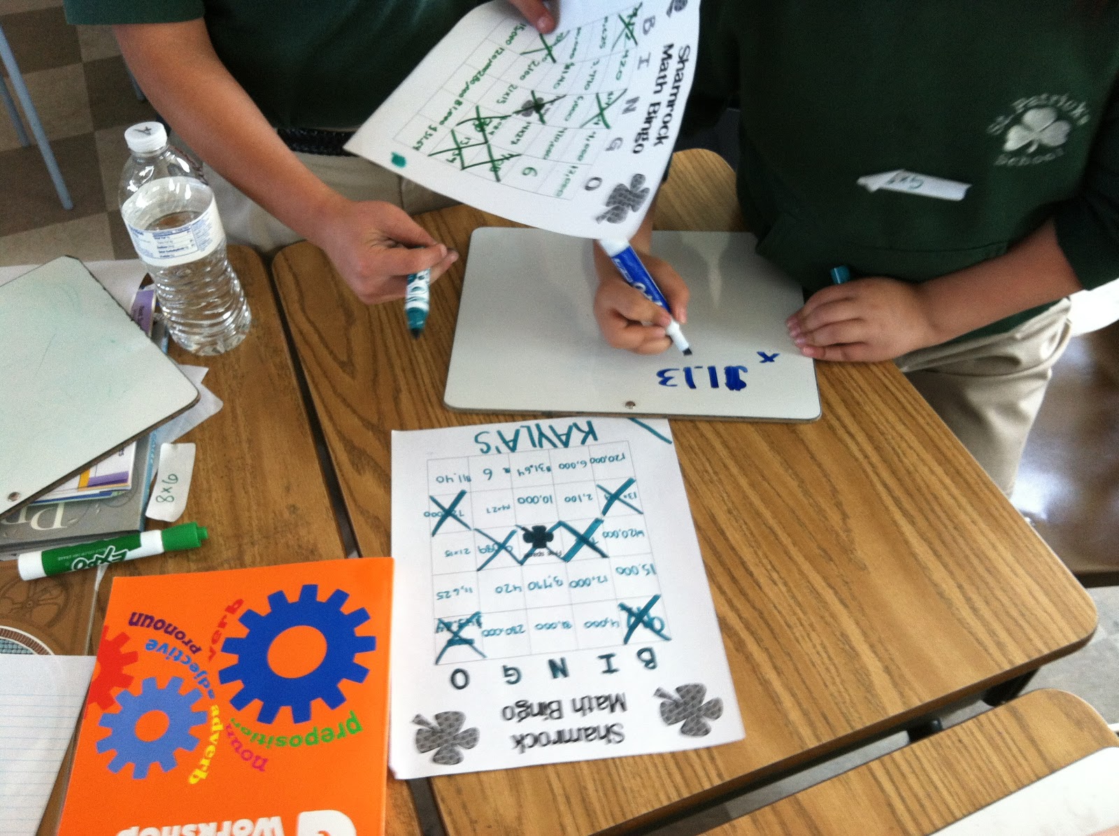 Then I gave them the question and they had to solve the problem and then find the answer on their Bingo card!聽They used their white boards to solve the problems.聽If the answer wasn’t on their Bingo card then that meant that they got the wrong answer and they needed to go back and check their work. Then, after most of the kids had finished, I had them check their answers with their team to make sure they had all gotten the correct answer before we moved on to the next question! If someone at their team was struggling, then they could help them out! I love seeing them using great teamwork!