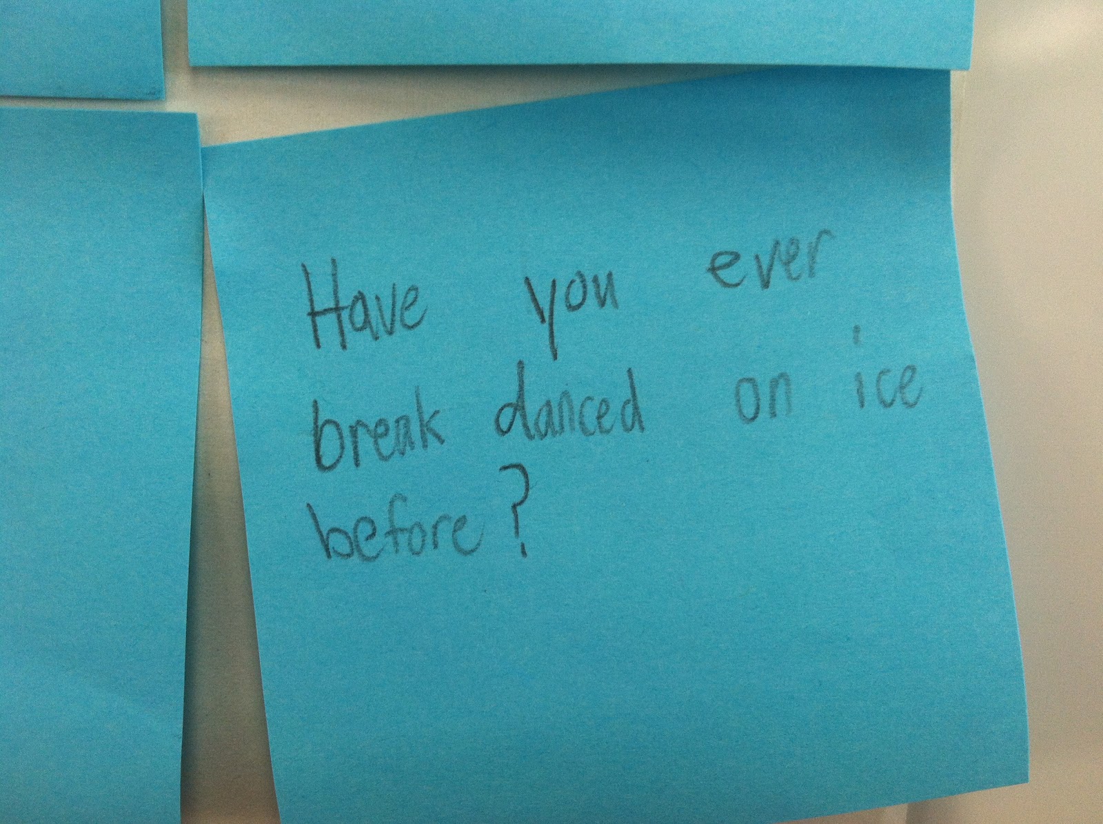 I had the (empty) chart up on the board, and each student got 4 different colored post-it notes. I wrote down which color corresponded to which type of sentence on the board for them to refer to. Then they worked with their team to come up with unique examples of each type of sentence. I loved what they came up with!